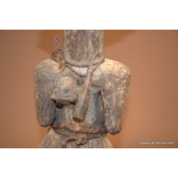 Les Songyé sculptent de magnifiques statues et statuettes ayant pour vocation de protéger le village. Cette statue parée de cuivre, os d'animaux et collier apportant la protection garde une âme mystérieuse. Cette pièce offre au collectionneur la certitude de posséder une statue d'exception.